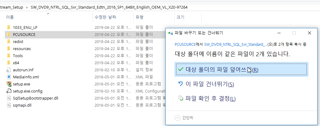 3) PCUSOURCE 폴더 안에 들어가서 setup.exe, SqlSetupBootstrapper.dll과 sqmapi.dll을 복사하고 RTM 설치 미디어 폴더 안에 덮어쓰기를 합니다.