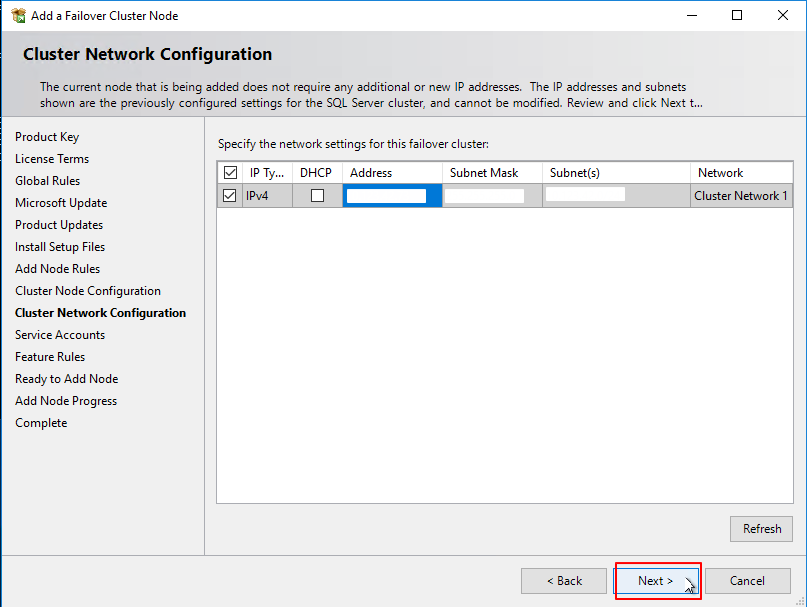 7) 최초 설치된 노드(Active)노드 정보를 확인하고, [Next]를 클릭합니다.