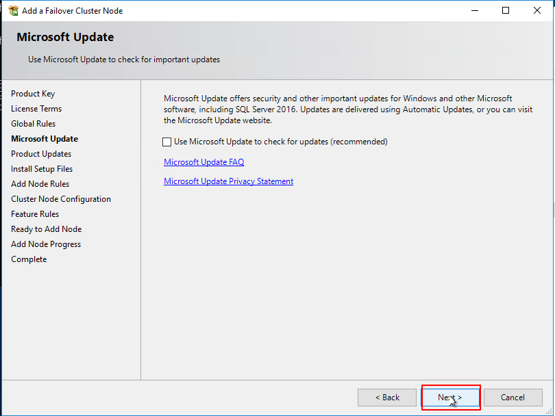 4) Microsoft Update check(선택사항)을 확인하고, [Next]를 클릭합니다.