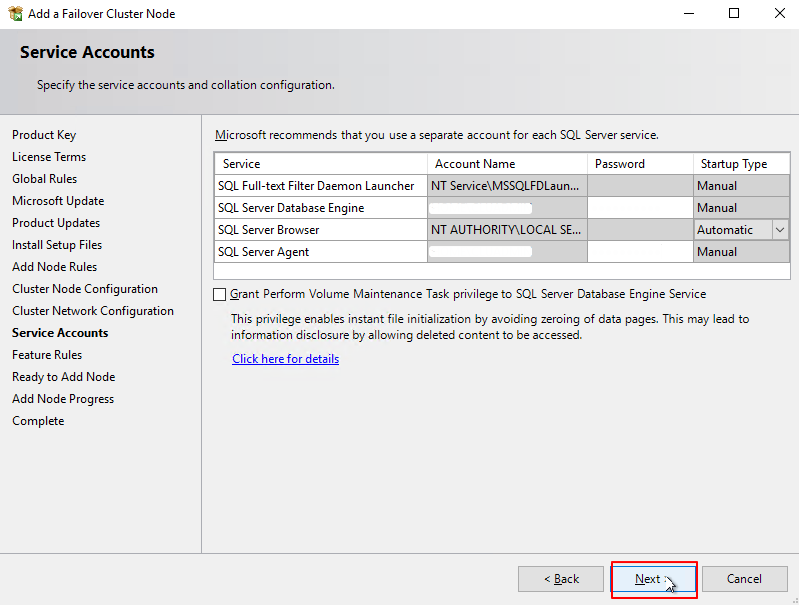 9) 각각의 서비스계정을 입력하고, [Next]를 클릭합니다.