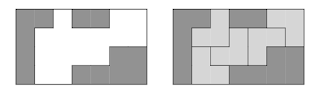 H*W 크기의 게임판이 있습니다. 게임판은 검은 칸과 흰 칸으로 구성된 격자 모양을 하고 있는데 이 중 모든 흰 칸을 3칸짜리 L자 모양의 블록으로 덮고 싶습니다. 이 때 블록들은 자유롭게 회전해서 놓을 수 있지만, 서로 겹치거나, 검은 칸을 덮거나, 게임판 밖으로 나가서는 안 됩니다. 위 그림은 한 게임판과 이를 덮는 방법을 보여줍니다.