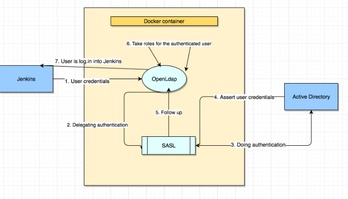 아래와 같이 구성하면 Active Directory 서버를 보호하면서 OpenLDAP을 이용하요 인증을 수행할 수 있다.
