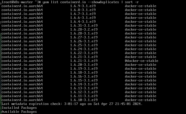 [root@k8s-master ~]# yum list containerd.io --showduplicates | sort -r