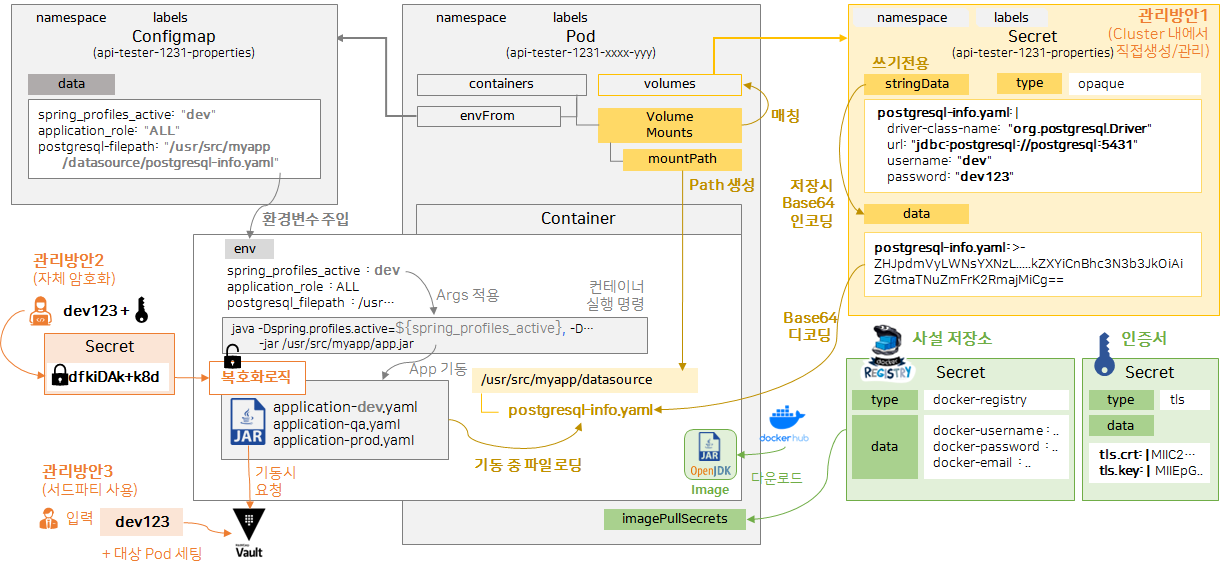 Secret을 Base64 저장하는 이유 : 인증서와 같은 바이너리 파일의 경우 문자열로 저장이 불가능합니다. 이와 같은 경우를 지원하기 위해 base64 인코딩해서 저장 할 수 있도록 함